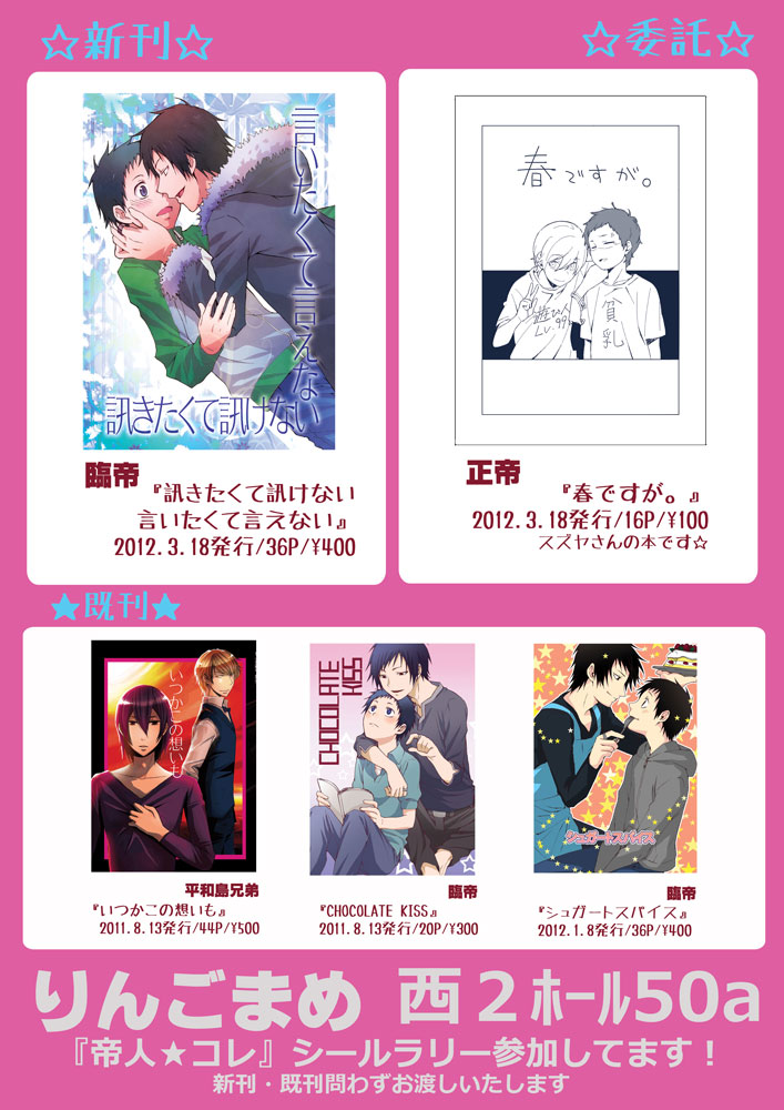 かなり今更なんですが、今日は新刊は無いですが、相方がペーパー漫画を描いてくれてます!あと、夏に出す平和島アンソロのフライヤーティッシュを配ってるので良かったら貰って下さい!!
